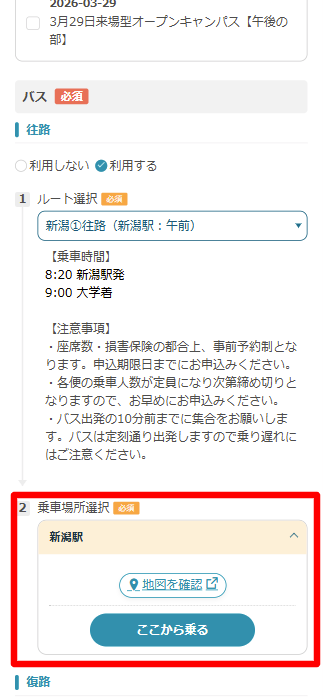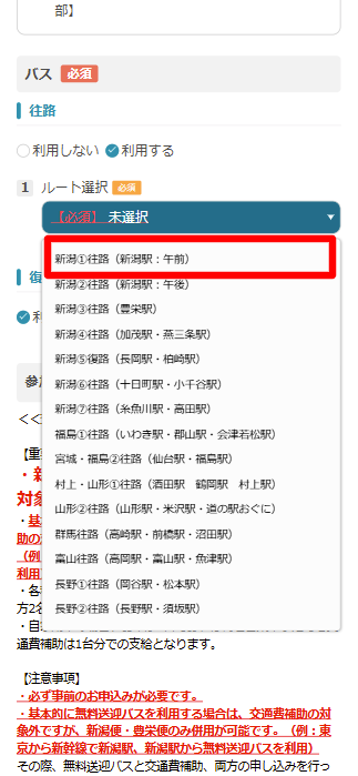その際、無料送迎バスと交通費補助、両方の申し込みを行ってください。