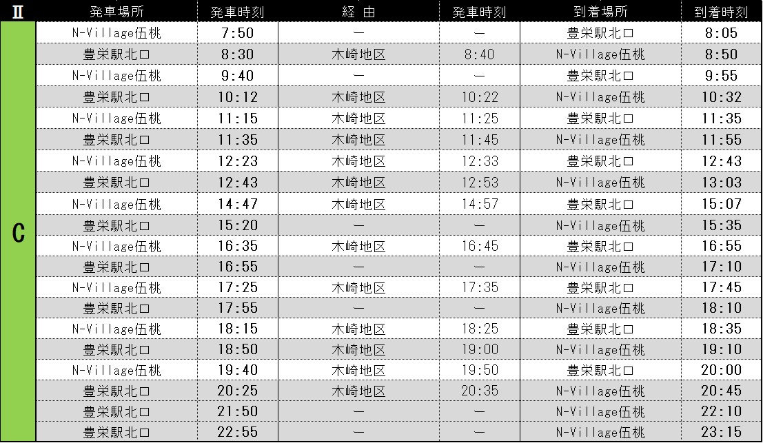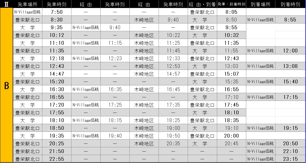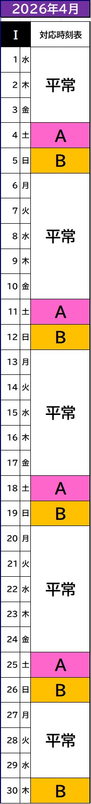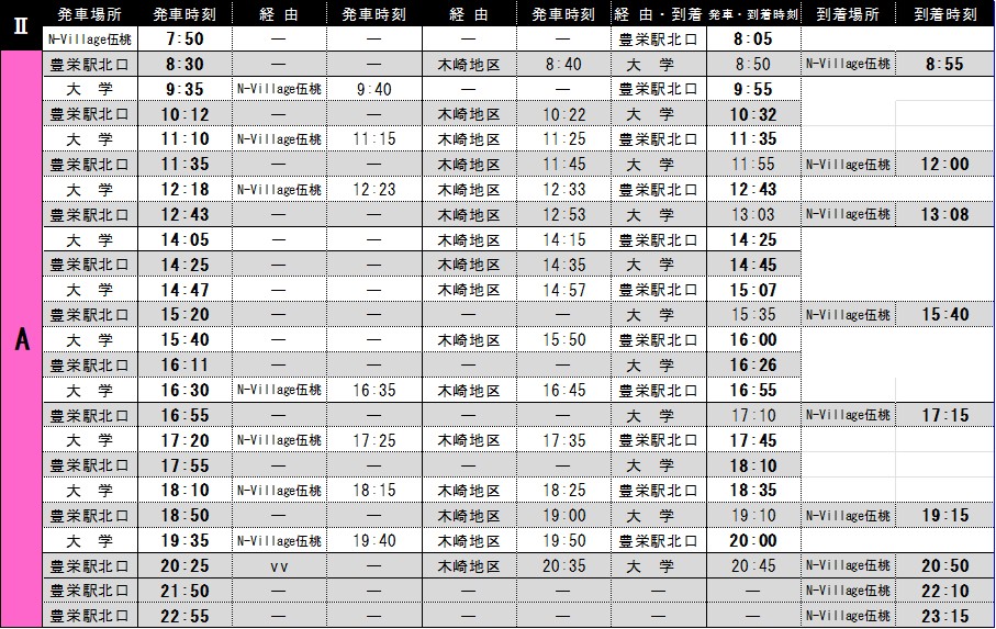 下の表「Ⅱ」の該当アルファベットの表がその日の時刻表となります。 表「Ⅰ」のうち“平常”と表記している日については、
