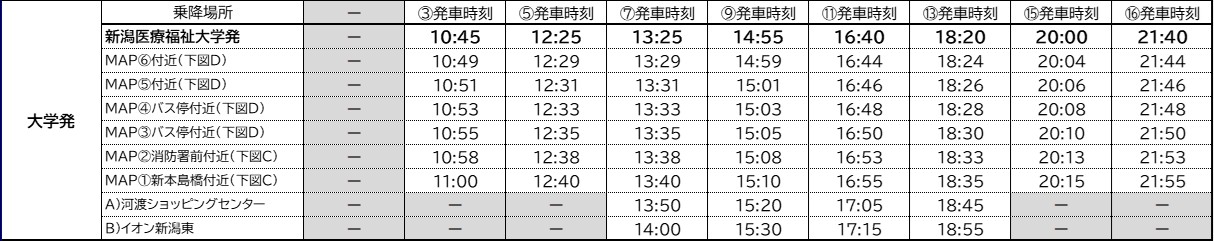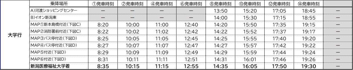 路線バスの運行時刻につきましては【新潟交通ホームページ】で最新時刻をご確認ください。