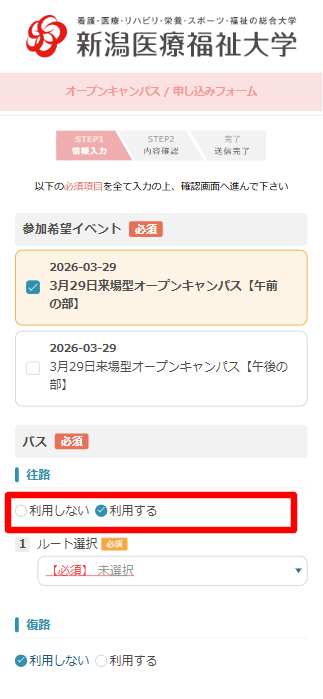 その際、無料送迎バスと交通費補助、両方の申し込みを行ってください。