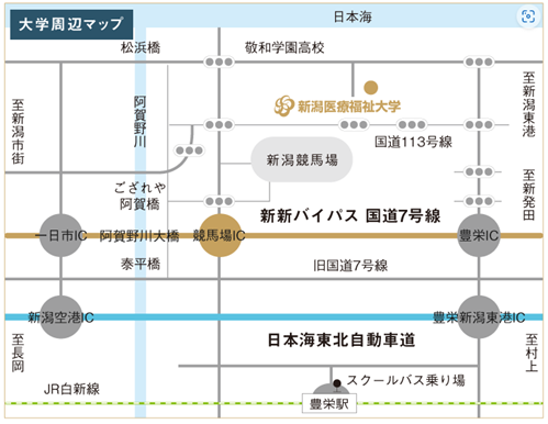 ・路線バスでは新潟駅万代口バスターミナルから、9番のりば空港・松浜線『新潟医療福祉大学行き』乗車、「新潟医療福祉大学」下車、または『太郎代浜行き』乗車、「新潟医療福祉大学入口」下車すぐ。