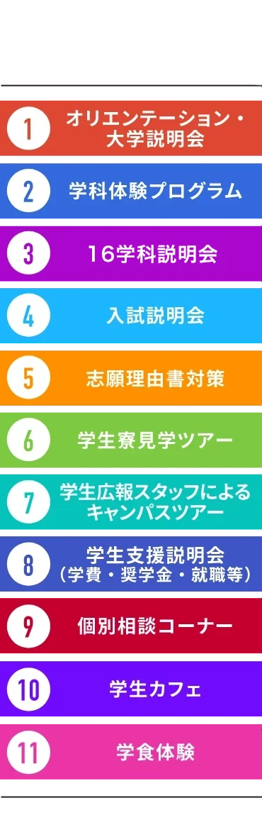 - 個別相談(学科全般,資格や進路)・施設ツアー・学生座談会