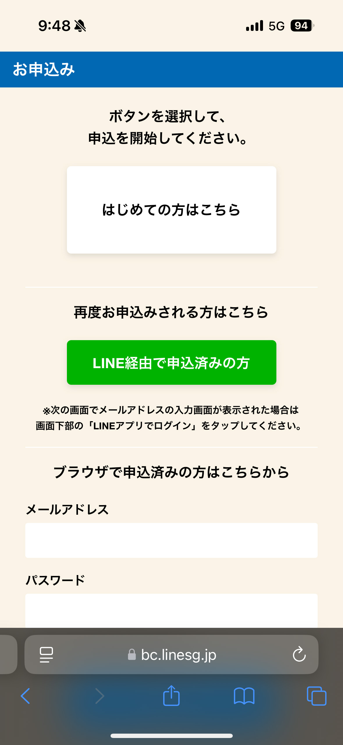 既にマイページをお持ちの方は「再度お申込みされる方はこちら」、「ブラウザで申込み済みの方はこちらから」の手順に従ってください。