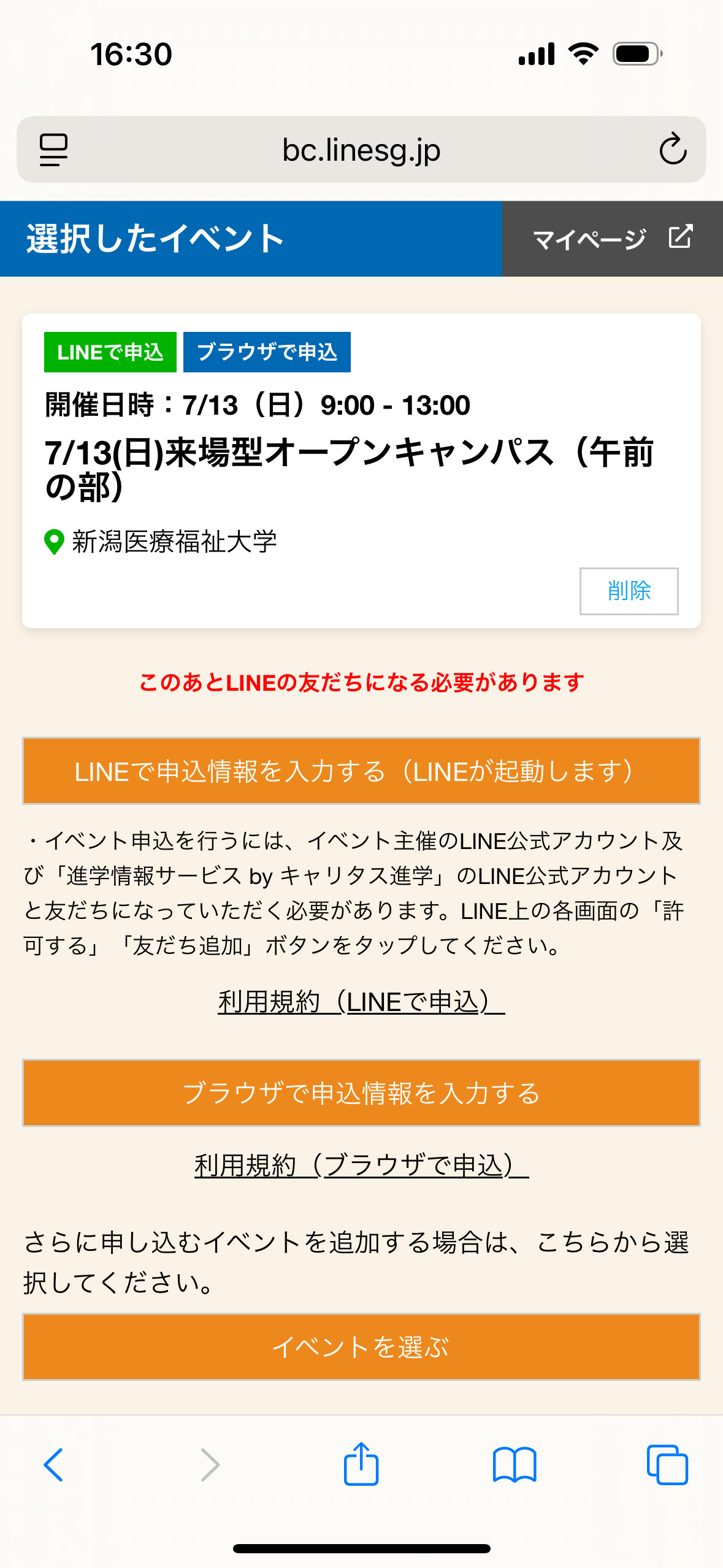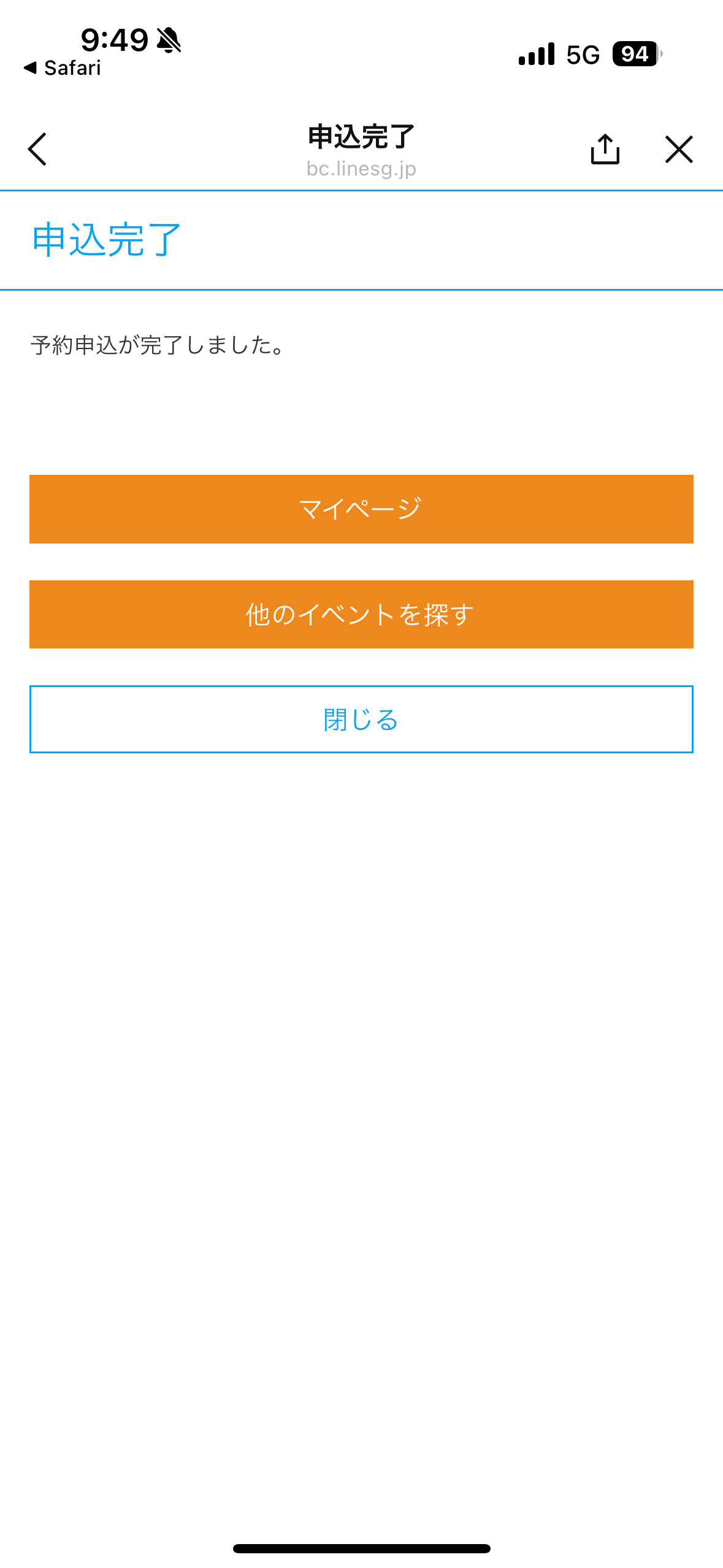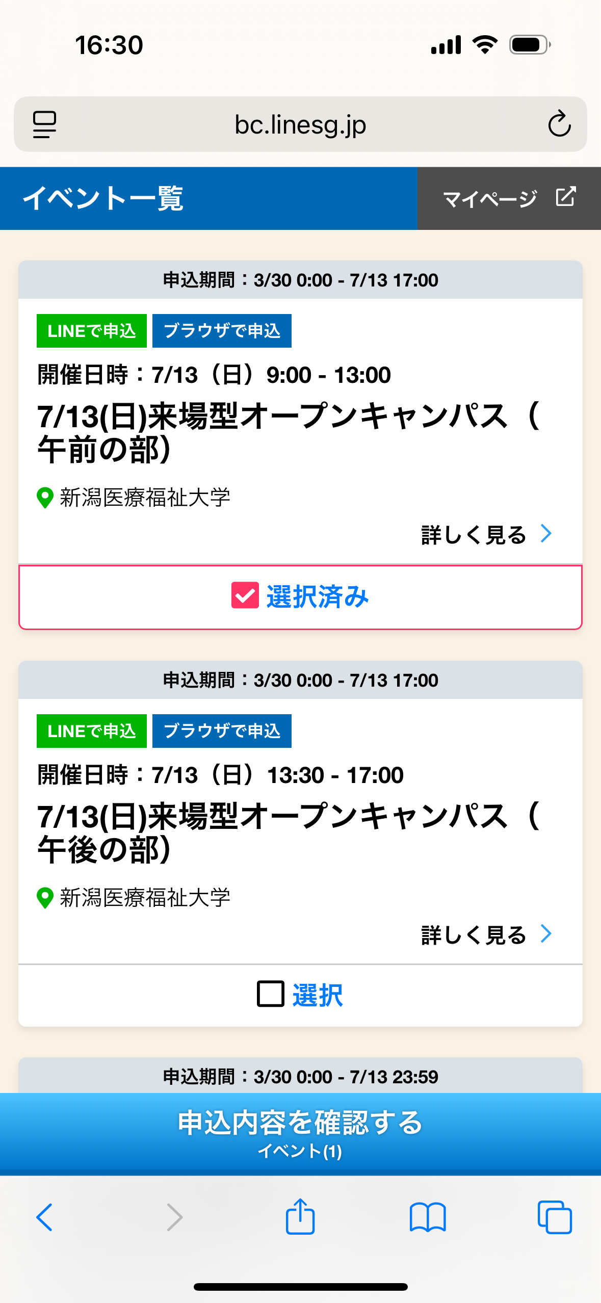 ブラウザで申し込みした場合、マイページの「申込イベント一覧」に申し込みをした便が追加されます。