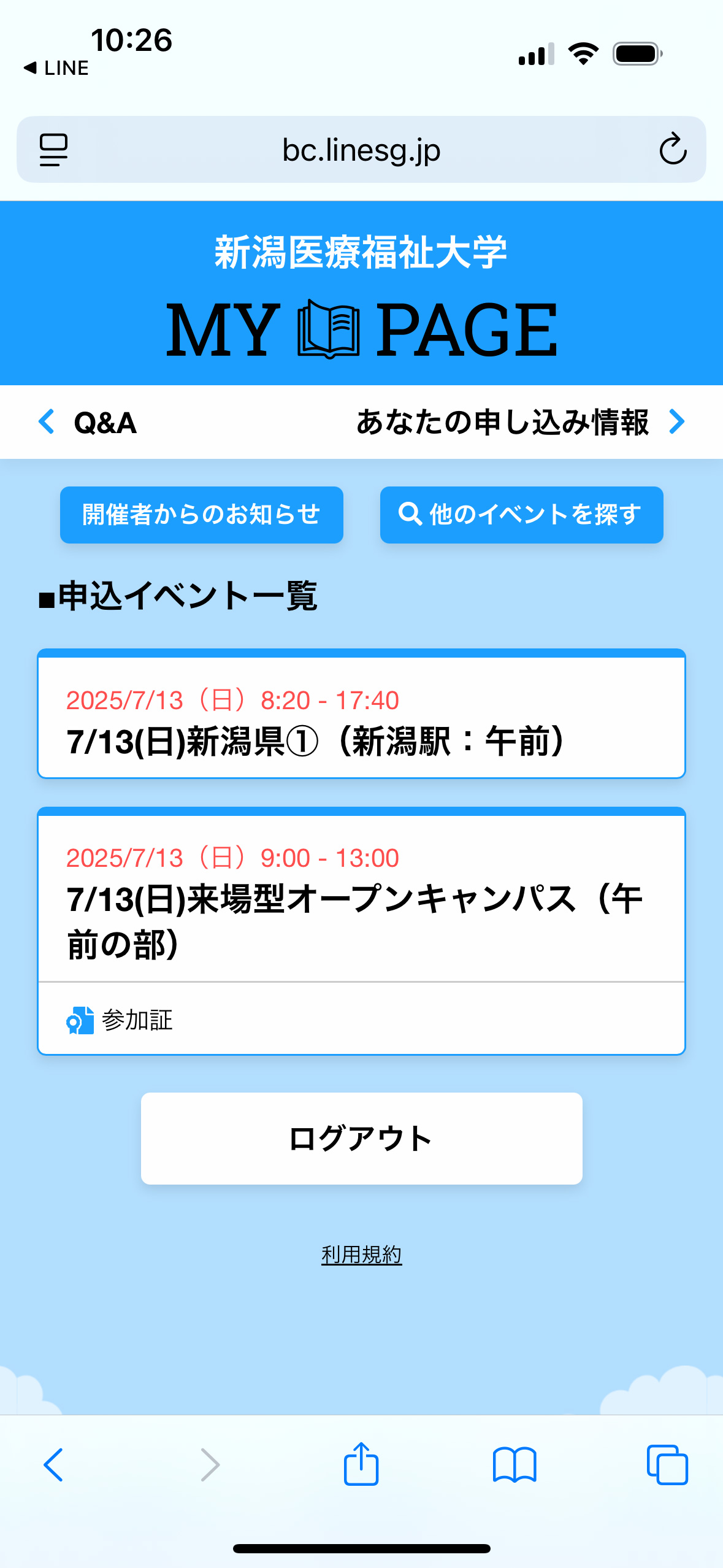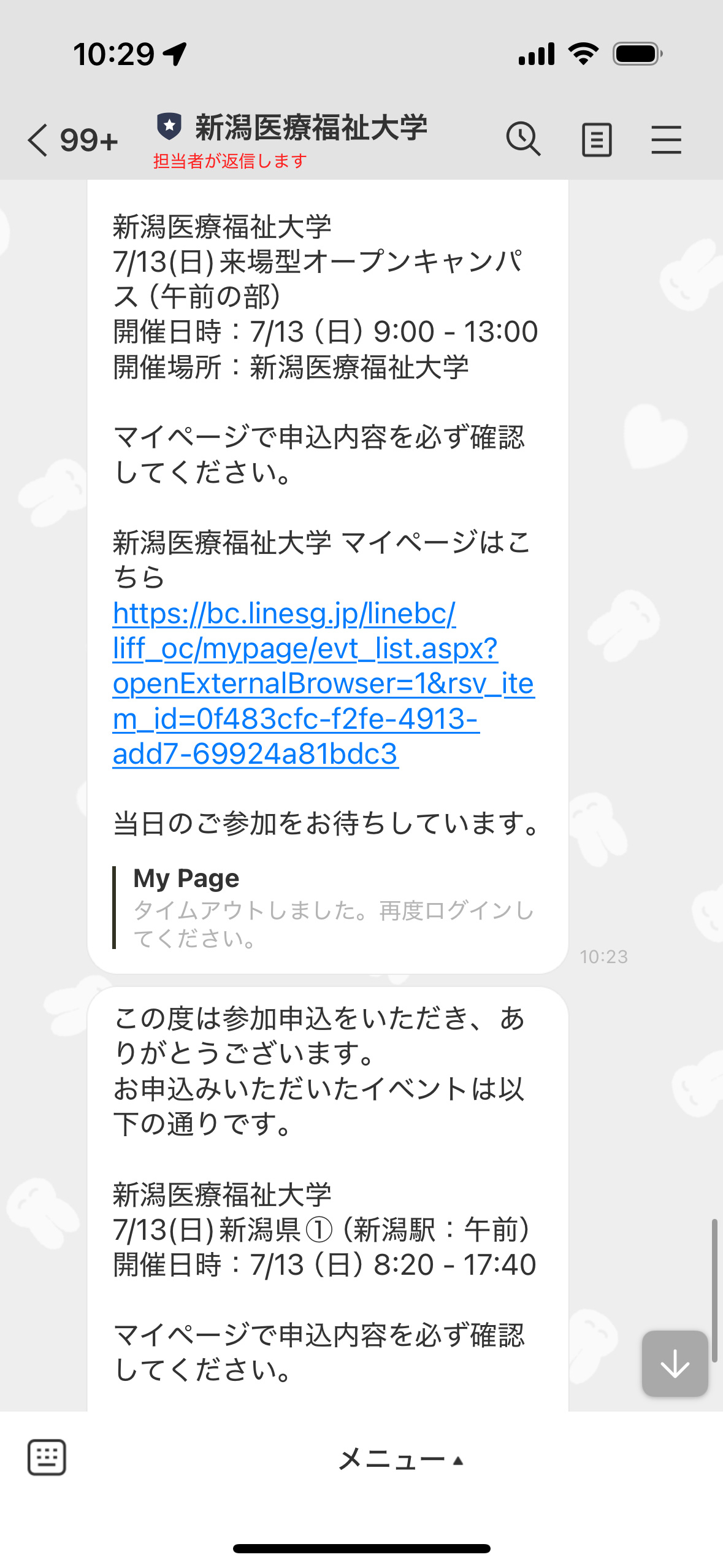 新潟医療福祉大学のLINE公式アカウントから、申し込みした内容の連絡が入ります。