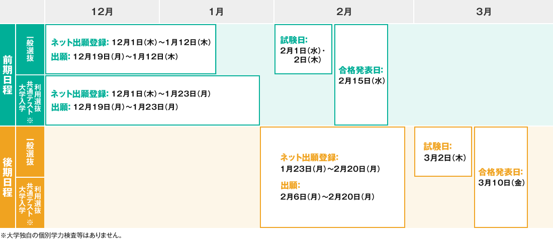 一般選抜と大学入学共通テスト利用選抜は、前期日程・後期日程共に「同時出願」が可能です。どちらの選抜区分でも合否判定を行うため、合格のチャンスが広がります。