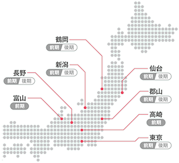 一般選抜(前期日程)は本学および学外7試験会場の計8会場から、一般選抜(後期日程)は本学および学外5試験会場の計6会場から、それぞれ受験地を選択することができます。