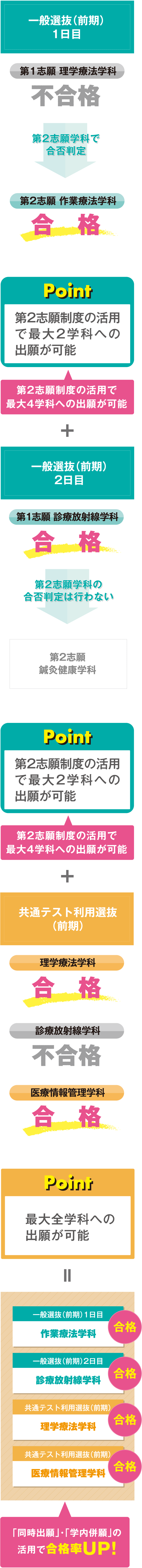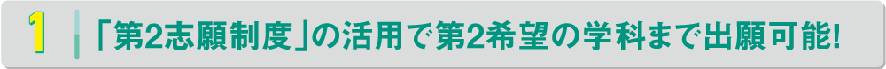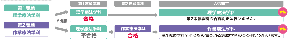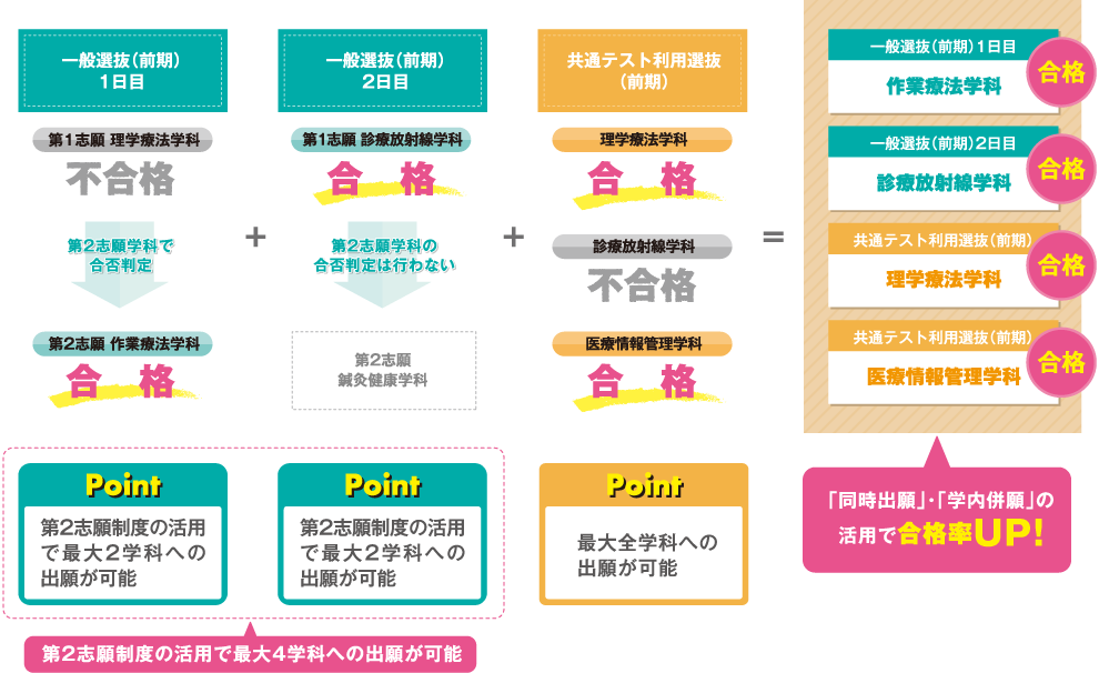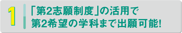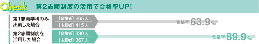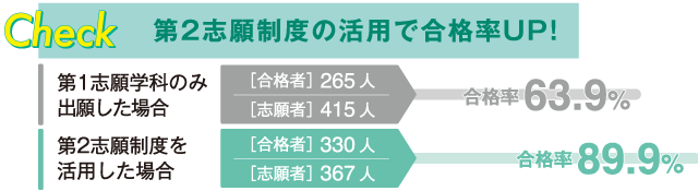 一度の出願で第2希望の学科まで志願できる「第2志願制度」を設けています。そのため第1志願学科で合格とならなかった場合でも、第2志願学科で合格となる場合があります。※理学療法学科・臨床技術学科・診療放射線学科・看護学科を第2志願学科として受験することはできません