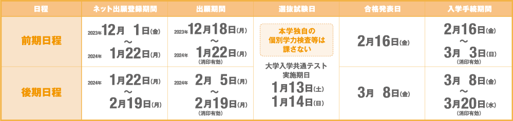 前期日程の出願締切は、1月22日(月)消印有効です。1月13日(土)・14日(日)に実施される大学入学共通テストを受験し、自己採点を終えた後でも出願できます。