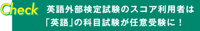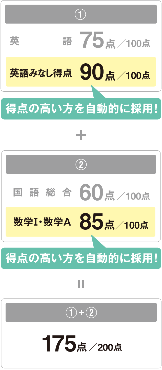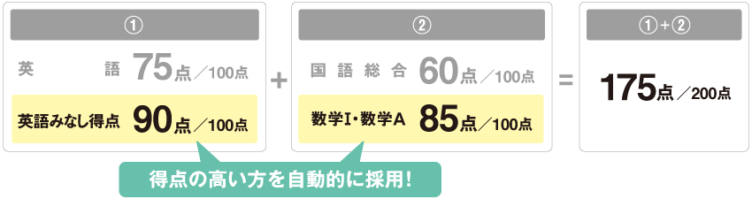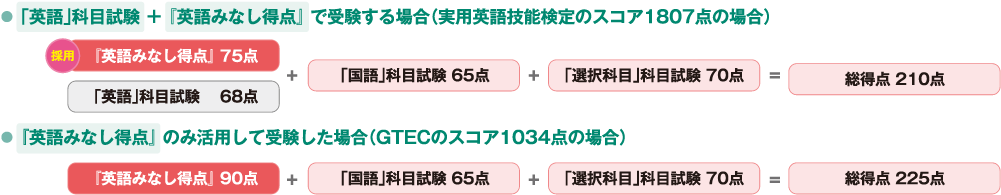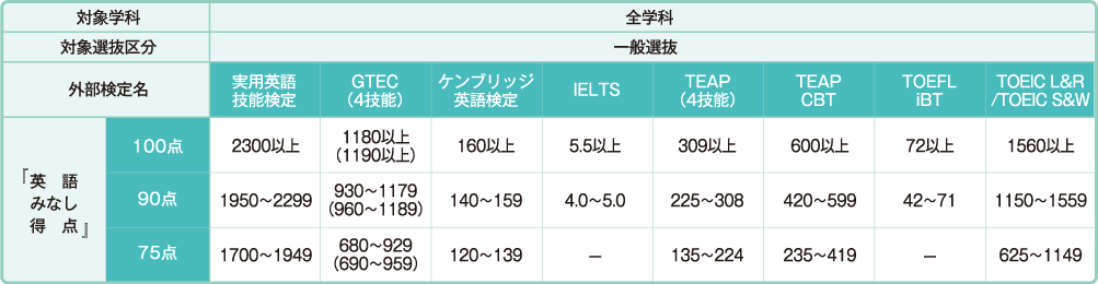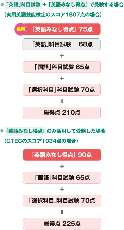 英語外部検定試験のスコアを利用する受験者が、「英語」の科目試験を受験した場合は、英語外部検定試験のスコアから換算した『英語みなし得点』と「英語」の科目試験の結果のうち高得点となる得点を合否判定に採用します。※特待生選抜の対象となるためには、英語外部検定試験のスコア利用をする場合でも、「英語」の科目試験を受験する必要があります。