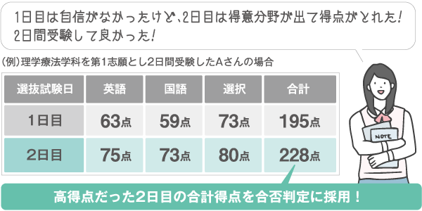 2日間(2月1日(木)・2日(金))ともに同一学科に出願した場合は、高得点だった選抜試験日の点数を合否判定に採用します。そのため、1日目に実力を発揮できずに合格点に満たなかったとしても、2日目の得点で合格する可能性があります。