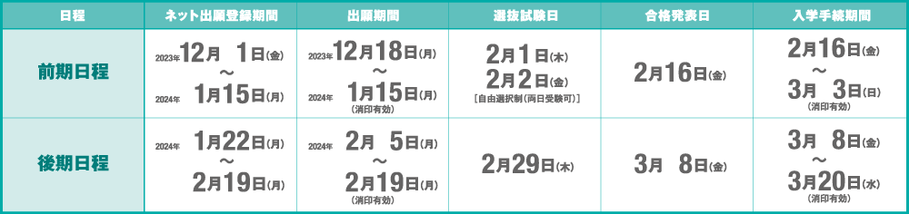 ※前期日程を2日間受験する場合は、同一会場に限ります。選抜試験日ごとに異なる会場での受験はできませんのでご注意ください。