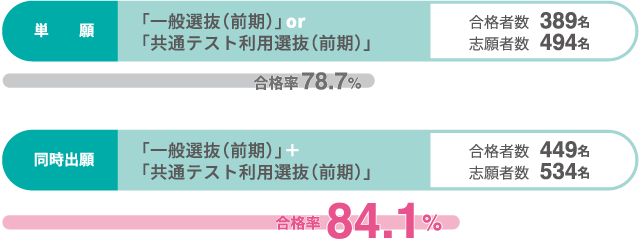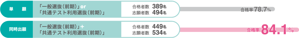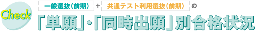 「一般選抜」と「共通テスト利用選抜」の前期で、どちらかの選抜区分にのみ出願した「単願」と両方の選抜区分にも出願した「同時出願」の合格状況を比較した結果、「同時出願」志望者の合格率が「単願」志望者の合格率を上回る結果となりました。合格の可能性を高めたい方や複数の学科に興味をお持ちの方は、「同時出願」をお薦めします。