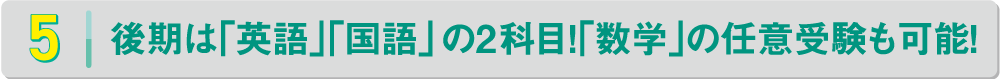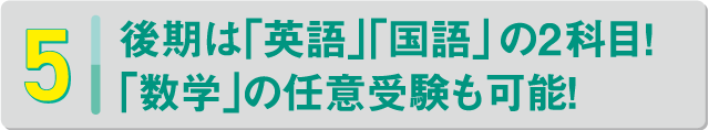 後期日程の試験科目は「英語」「国語総合」の2科目です。また、任意の受験科目として「数学Ⅰ・数学A」を受験することができます。「数学Ⅰ・数学A」を受験した場合は、「英語」科目試験もしくは『英語みなし得点』※、「国語総合」または「数学Ⅰ・数学A」のうち、高得点の1科目を合否判定に採用します。※英語外部検定試験のスコア利用制度による換算点
