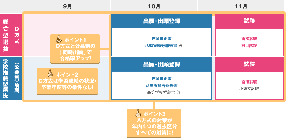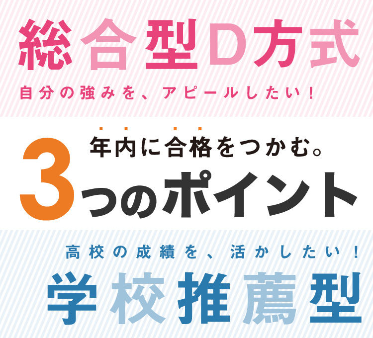 総合型選抜A方式に課される「レポート課題・面接課題」の対策は、学校推薦型選抜(公募制)の「小論文試験」対策につながり、「基礎教養試験」の対策は総合型選抜D方式の「基礎学力試験」の対策につながるため、総合型選抜A方式の対策を中心に行うことをおすすめします。