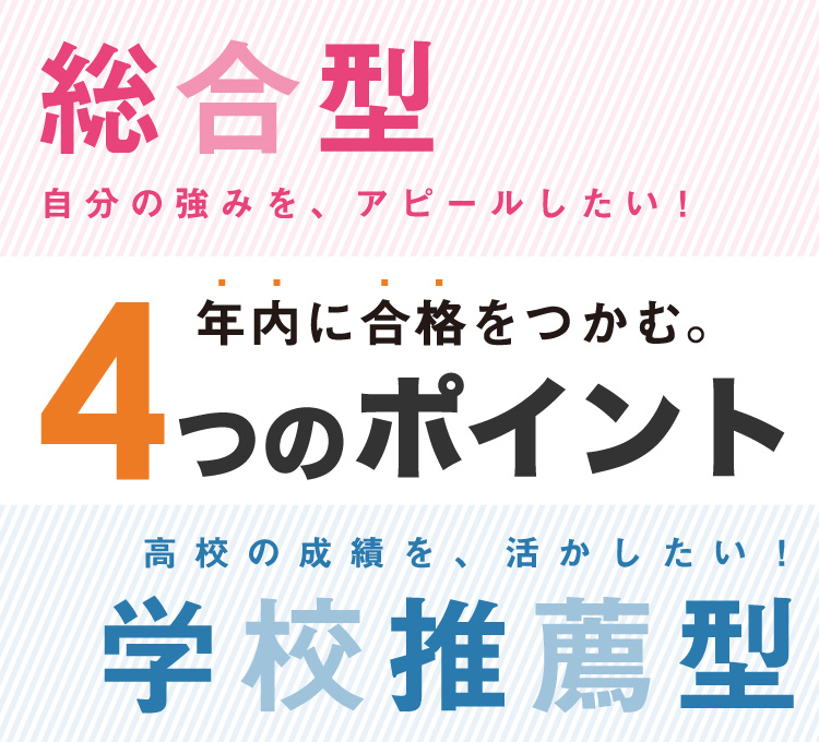 総合型選抜A方式に課される「レポート課題・面接課題」の対策は、学校推薦型選抜(公募制)の「小論文試験」対策につながり、「基礎教養試験」の対策は総合型選抜D方式の「基礎学力試験」の対策につながるため、総合型選抜A方式の対策を中心に行うことをおすすめします。