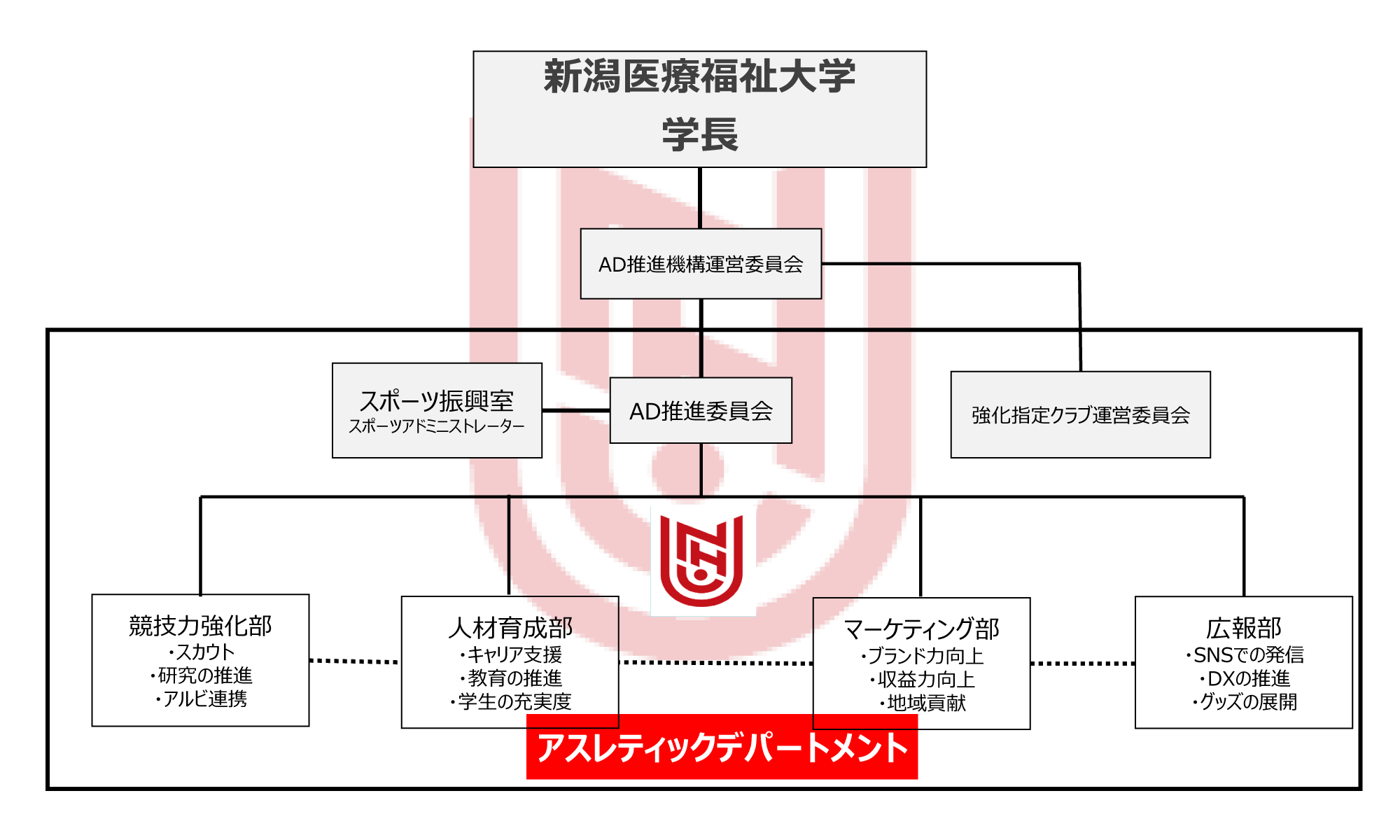 大学スポーツは、日本における社会資本の一つとして位置づけられてきています。本学ADは新潟からオリジナリティの高い大学スポーツのイノベーションを起こしていきます。医療・リハビリテーション・栄養・スポーツ・健康科学・ITなどの医療系総合大学であることから、その高度専門職を目指す学生が「NUHWアスリートサポートシステム(NUHW ASS)」によって、アスリート学生のパフォーマンス向上・障害予防に向けたサポートを行っています。