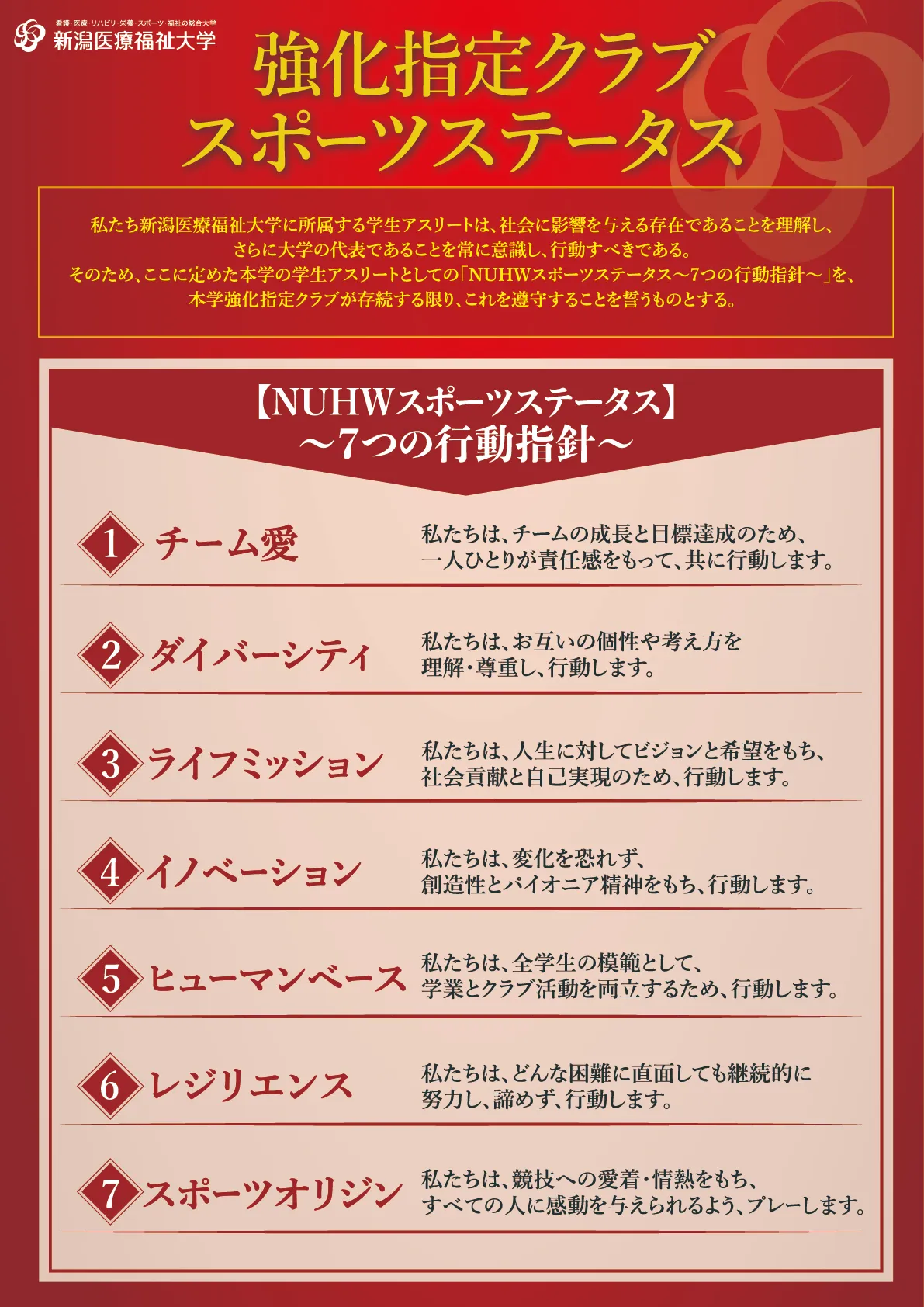 新潟医療福祉大学アスレティックデパートメントは、強化指定クラブの活動を通じて「優れたQOLサポーターを育成」して、人々の幸福と豊かさを実現する