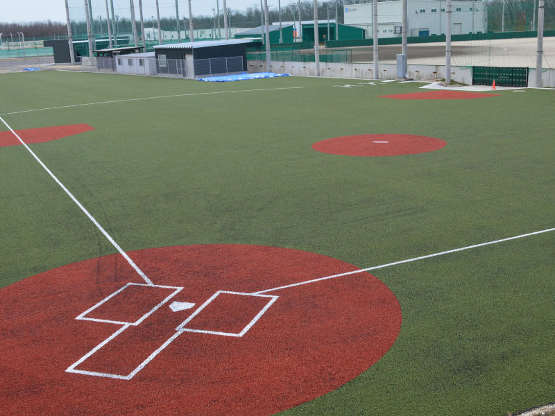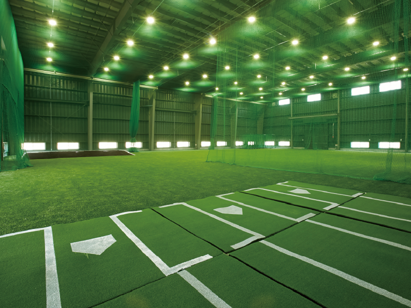 硬式野球グラウンド(両翼101m、中堅120m)のほかに、バッティング練習(2カ所)、ピッチング練習(3カ所)が同時に行える全面人工芝が施された屋内野球練習場や6人同時投球が可能でナイター設備もあるブルペンを有し、悪天候時や冬季の練習にも対応できる環境が整っています。