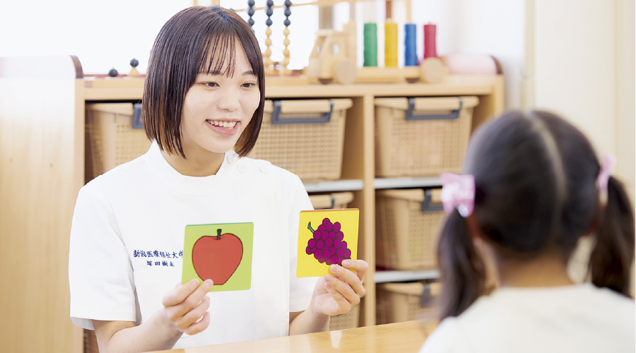子どもの言葉の遅れに対して、絵本を見せて言葉を引き出したり、文字の習得ができるように指導を行ったりします。また家族や教育機関と連携し、子どもの周辺環境を整える役割も担っています。