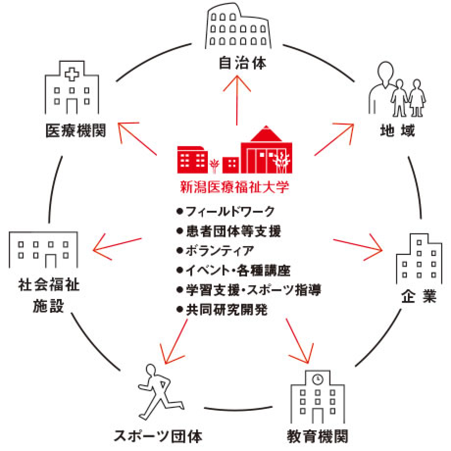 本学では、新潟市をはじめとした自治体との連携事業のほか、学生と教員の協働による様々な地域貢献活動や教育・研究活動を行っています。こうした活動に、学生が積極的に関わることで、それぞれの目指す専門職としての技術に加え、主体性やコミュニケーション能力など、QOLサポーターとしての実践力を磨くことができます。