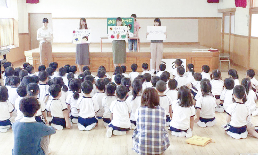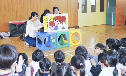 新潟県内の保育園で子どもを対象とした「眼の講習会」を実施しています。講習会では、眼の健康・大切さを理解してもらうために絵本の読み聞かせやゲーム大会などを実施し、良く見ることを訓練することで視覚の発達を促進します。この講習会は大変好評で多くの保育園から講演依頼が殺到しています。また、視能訓練士は小さな子どもの検査や訓練を担当することが多いため、地域に根差したこのような取り組みにより、子どもの眼の健康管理ができる視能訓練士としての実践力を身につけます。