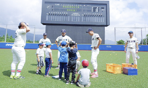 スポーツ指導に関する授業の一環として、新潟県・南魚沼市、小千谷市、新潟市などで野球教室を実施しています。活動を通じて、硬式野球部・軟式野球部の学生たちが、地元の幼稚園児、小・中学生と毎年交流を続けています。この野球教室は「野球」×「遊び」をかけ合わせた企画を通じ、野球の普及、競技継続による健康増進、次世代の指導者育成なども狙いとしています。学生たちは活動を通じ、地域社会の現状や課題を肌で感じただけでなく、スポーツを通じた地域活性の実践についても学ぶことができました。