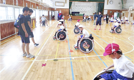 新発田市との連携により、市内の小・中学校、特別支援学校で、健康スポーツ学科の教員と学生がパラスポーツ教育を実施しています。児童・生徒は、本学教員や学生のサポートを受け、車いすバスケットボールやボッチャ、ブラインドサッカーなどの体験を通して、「障害とは何か」を考えます。「サポートがあれば障害のある人と一緒にスポーツを楽しめる」「部活動と変わらない」などの気づきが、児童・生徒の障害への理解を深め、学生はスポーツ教育を実践的に学びました。