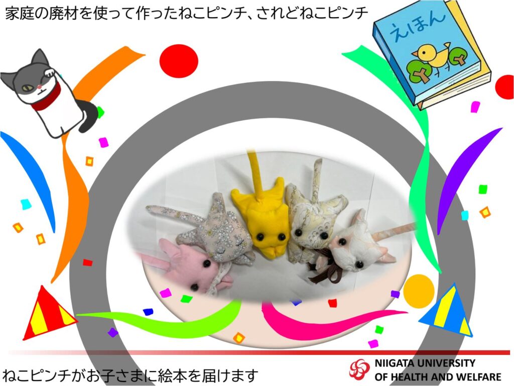 「ネコピンチプロジェクト」は、現代の子どもたちの絵本離れに対する問題意識から生まれた取り組みで、学生が主体となって進めています。このプロジェクトでは、大勢の大学生が協力して「ネコピンチ」を制作し、その販売収益を活用して絵本を購入します。そして、購入した絵本を子ども園に届けることで、子どもたちが絵本に触れる機会を増やし、読書への興味を育むことを目的としています。