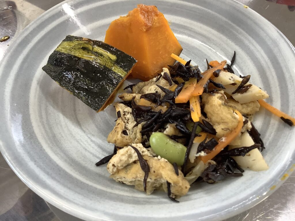 かぼちゃの煮物とひじきの煮物を作りました。「乾いたひじきを初めて触った!」と、小学生の目がキラキラしていました。