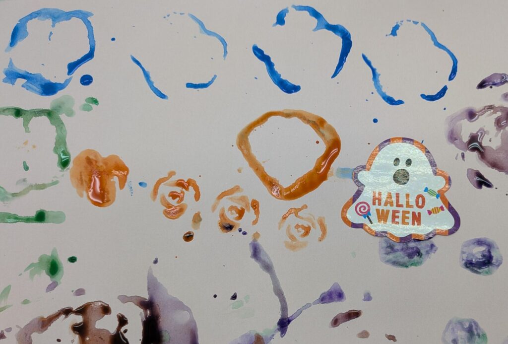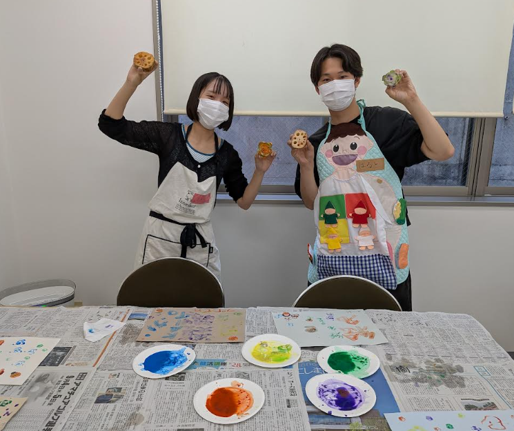 4日の食育は「野菜を好きになろう!」というテーマで、まずは「野菜の量」について話をしました。1日350g以上の野菜をとるために、1食でどのくらいの野菜を食べたらいいのか?いろいろな野菜を組み合わせて考えました。その後、野菜のヘタなどの廃棄部分を使って、野菜スタンプをしました。