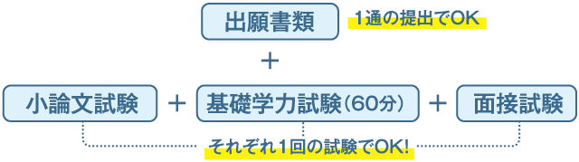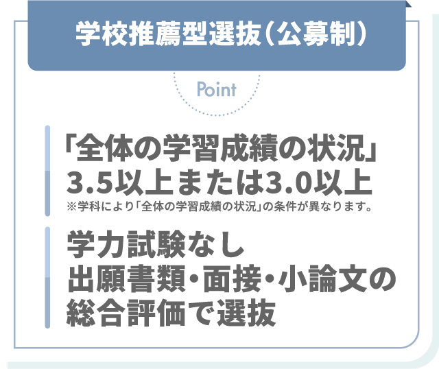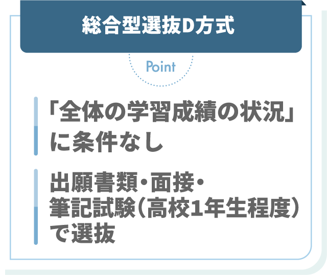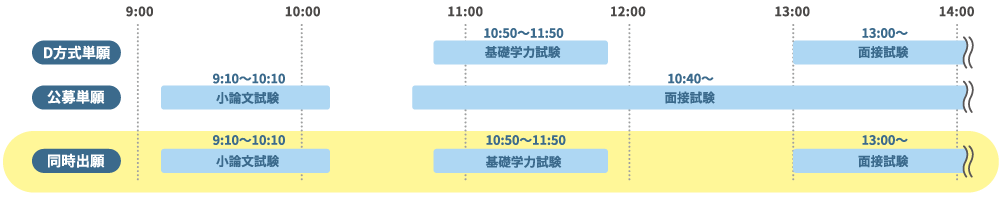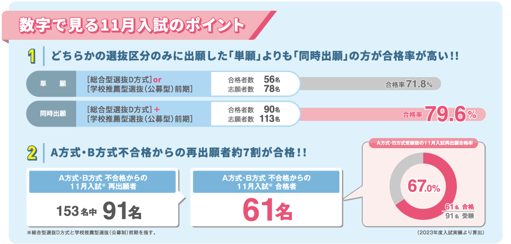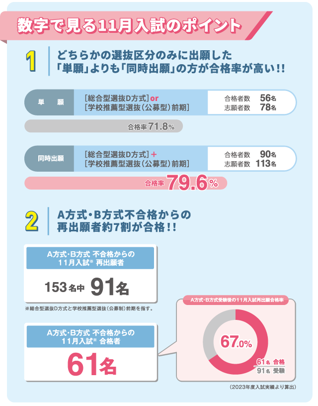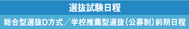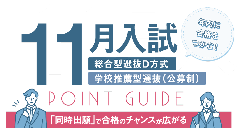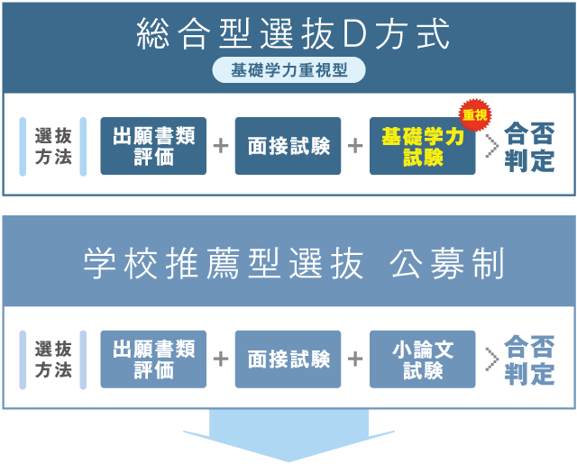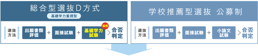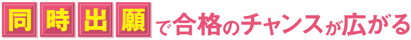 総合型選抜D方式(基礎学力重視型)と学校推薦型選抜(公募制)前期日程は、どちらの選抜区分においても出願条件を満たしており同一学科を志願する場合、両方に出願する「同時出願」が可能です。選抜方法が異なる選抜区分を「同時出願」することで、合格のチャンスが広がります。