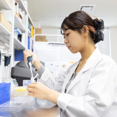 ツボがどうして効くのか疑問に思い、大学ならではのヒトやマウスの細胞を使って、鍼が体にどのように働くのかを調べています。将来は、ツボの効果を正しく理解し、肩こりや腰痛などに悩む患者さんに安心感と信頼感を与えられる鍼灸師になりたいです。