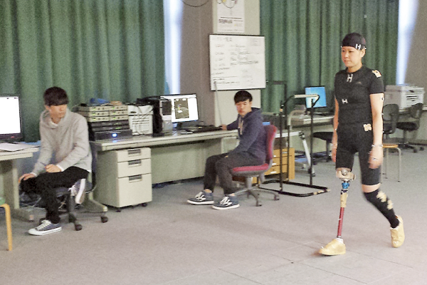 製作された義肢装具が機能しているかを評価するために、人の歩行や歩き始め、立ち上がりなどの動きのメカニズムを学びます。また、三次元動作解析装置で実際の患者様の計測と分析を行い、義足や装具の運動への影響を、グループワークを通して学びます。
