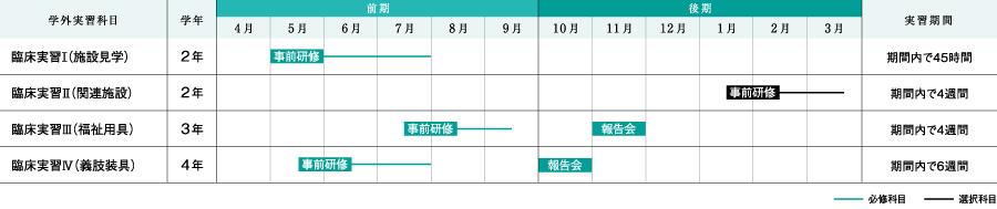 ●義手学実習 ●下腿義足学実習 ●体幹装具学実習 ●靴型装具学実習 ●福祉用具コミュニケーション機器学演習 ●臨床実習Ⅰ(施設見学) ●臨床実習Ⅱ(関連施骰) |