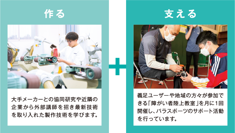 アスリートが最高のパフォーマンスを発揮するための義肢・装具を「作り」「支える」力を実践的に学びます。スポーツ現場では、ユーザーの心身の状態や成長に寄り添い、使用環境・競技種目に応じて、一人ひとりに合わせた細かな調整を行う高いスキルが求められます。本学科では、スポーツインソールやサポーター製作のほか、スポーツ義足に関する研究活動、障がい者スポーツ大会のサポーターなど、積極的に実践の場に参加しています。
