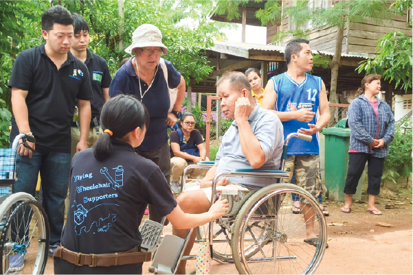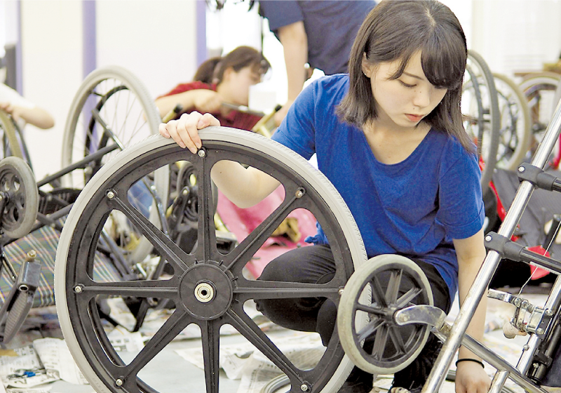 本学科を中心に活動している「空飛ぶ車椅子サークル」は、一般の家庭や病院、施設などで使用されなくなった車椅子を回収・修理・整備し、東北の被災地や東南アジアをはじめとする発展途上国に届ける活動を行っています。学内では、車椅子の修理に関する勉強会を定期的に開催し、車椅子とシーティングに関する知識・技術について学んでいます。また学外では、国内外で開催される車椅子修理会への参加や車椅子整備のために県内の福祉施設を訪問しています。本学科では、こうした活動を支援し実践的な技術の修得と国際的な活躍を目指します。