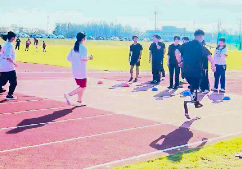 本学では、四肢切断者を対象に、月に一度ランニング教室「NUHW ParaTFC(障害者陸上教室)」を開催しています。「NUHW ParaTFC」では、義足ユーザーに対して部品の貸し出しやグラウンドの提供を行うことで、気軽に参加できる環境作り、ランニング指導を実施しています。学生たちは、こうした活動に参加することで、スポーツ義肢の特性を理解するとともに、障害者アスリートへの支援や他の専門職との連携について体験的に学ぶことができます。