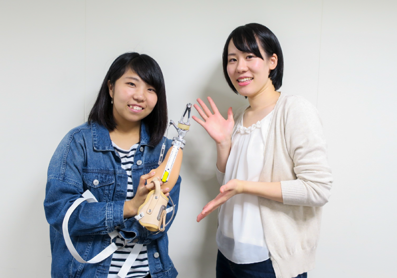 佐々木美里さん(当時4年生)と澤谷歩さん(同)が共同で製作した義手が「福祉機器コンテスト(日本リハビリテーション工学協会主催)」の学生部門で最優秀賞を受賞しました!生まれた時から片腕がない佐々木美里さんは、義肢装具士を目指して本学科へ入学し、その卒業研究を通して、今の自分に“できること”と“できないこと”を抽出し、どのような機構を持った義手であれば今までできなかった作業ができるようになるのかに着目し、まったく新しい発想の義手を製作しました。本来ならば、良い腕の長さや形に合わせる義手ですが、製作工程や作業効率を向上させる目的で義手の長さを自在に調整することができる義手を製作しました。製作した義手を使用することで、一人ではできなかった作業工程が可能になりました。この義手は製作者2名の想いとアイデアが詰まった傑作品です!この素晴らしい結果は、新潟県内および全国、さらには世界でTV放映されました。