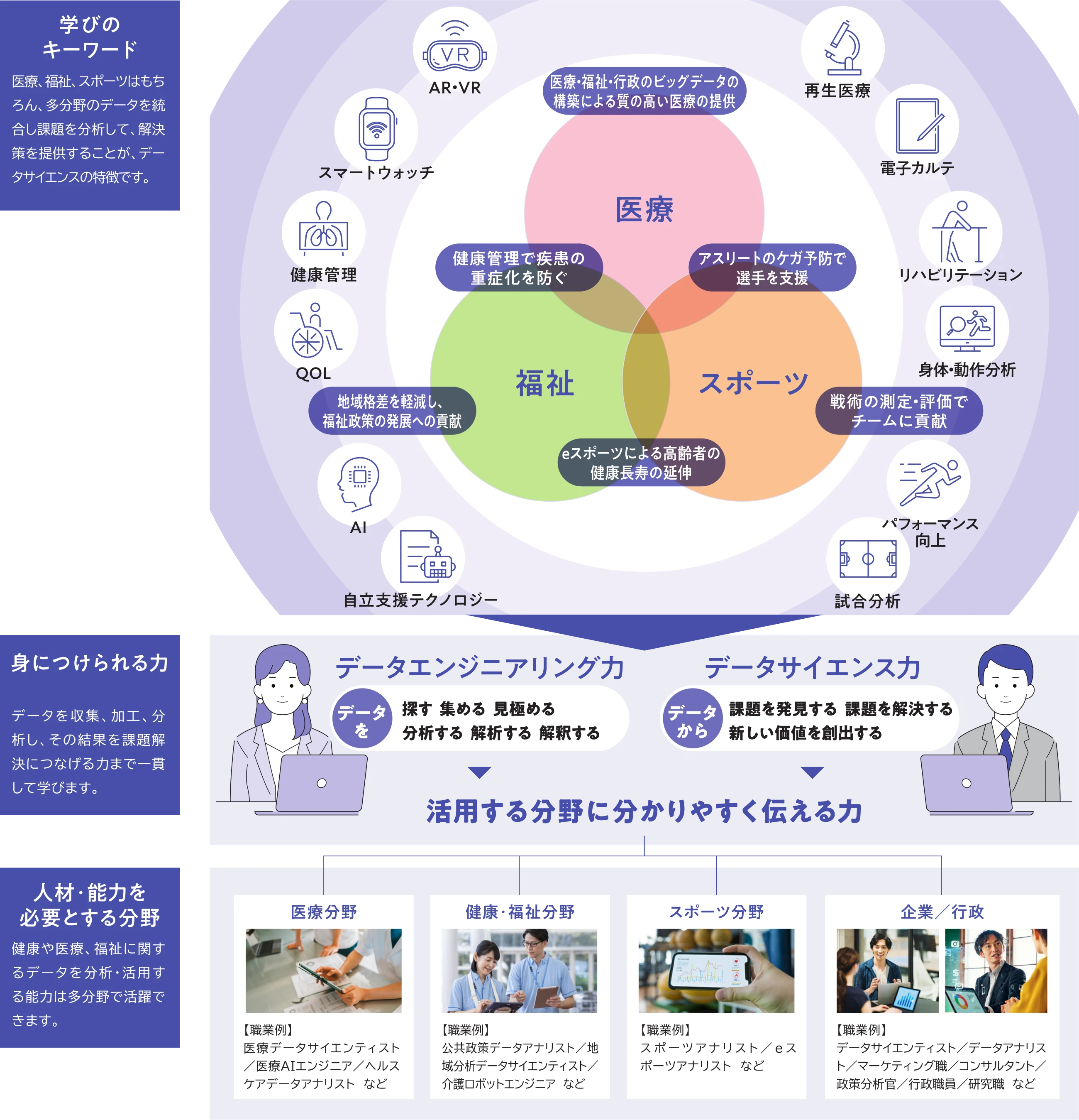 医療・福祉・スポーツ分野を強みとする本学ならではの教育環境のもと、人の健康や暮らし、スポーツを支えるデータサイエンスを学びます。統計学やプログラミング、AIなどの基礎を体系的に修得し、データを正しく読み解き、根拠に基づいて考える力を養います。さらに、各分野の専門知識とデータ活用を結びつけ、実際の現場を想定し、データを用いて課題解決に取り組むことで実践力を高めます。医療の質向上や福祉サービスの最適化、スポーツにおけるパフォーマンス向上など、多様な領域で新たな価値を創出できる人材を育成します。