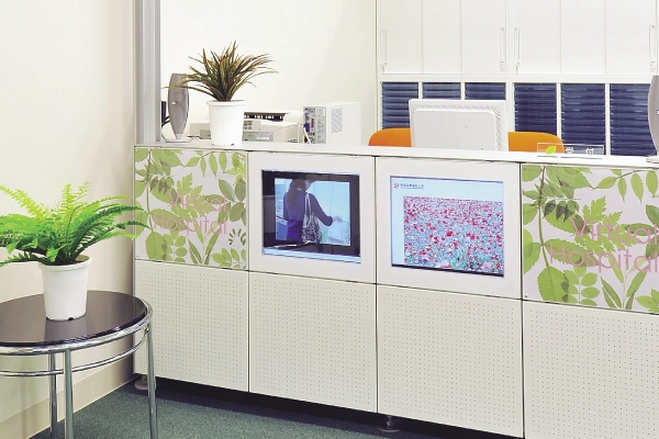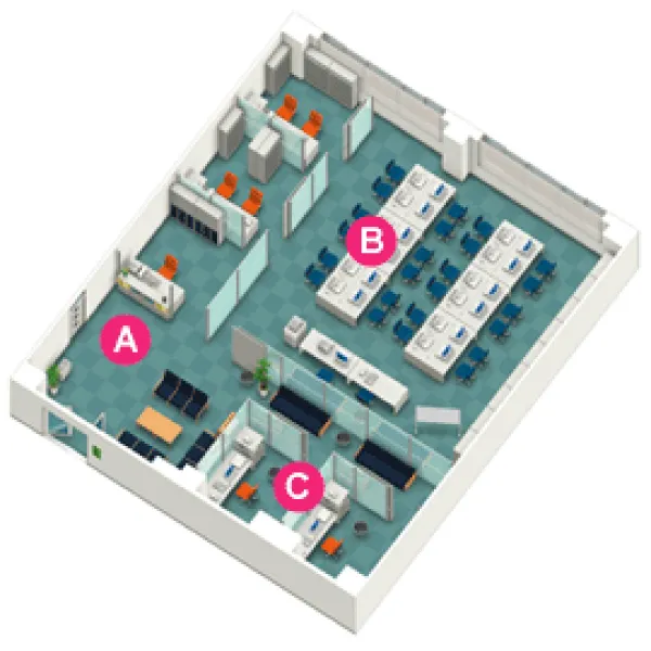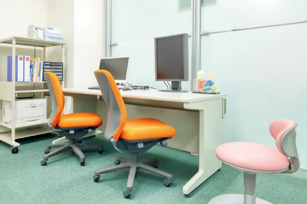 本学科では、より高い実践力を身につけるため学内実習施設として「バーチャルホスピタル(医療情報実習室)」を設置しています。この実習室では、実際の病院や福祉施設を想定した受付、医療事務室、診察室などを配置し、各セクションで必要となるスキルについて実務に即して体感しながら学ぶことができます。