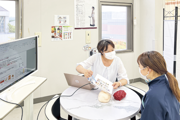 この科目では、科学的根拠に基づく効果的な栄養指導のアセスメント、計画、実施、評価までの一連の方法を学びます。指導する対象は、幼児から高齢者、妊婦、アスリート、そして食物アレルギーや生活習慣病を持つ方々など多岐に渡ります。さらに、学生による模擬患者への個別栄養指導も実施します。