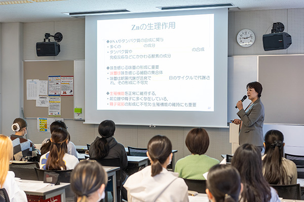 栄養の基礎知識を身につける科目です。「栄養とは何か」を理解するため、その基本概念、食生活やエネルギー、栄養素の機能や生体などとの関わりを学びます。またその知識に基づき食を科学的に考え、健康の保持・増進における役割を理解します。