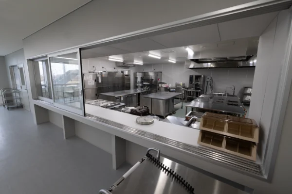 大規模な給食施設には、給食管理者として管理栄養士または栄養士が配属されます。この実習室では、給食施設における栄養管理、作業管理、食材管理、衛生・安全管理、栄養教育、喫食者サービスおよび大量調理等の実践的な手法について学びます。調理室の他、下処理室や食器洗浄室を完備し、また衛生管理の面から、それらの作業は全て異なる部屋で行われるように設置されています。
