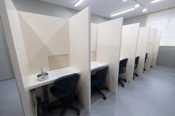 官能評価はある食品の嗜好性や味、やわらかさなどの評価を行う評価方法です。人の感覚に左右される評価方法であるため、評価を実施する環境の整備が欠かせません。そのために、この検査室を整備し、学内実習、卒業研究などで活用しています。