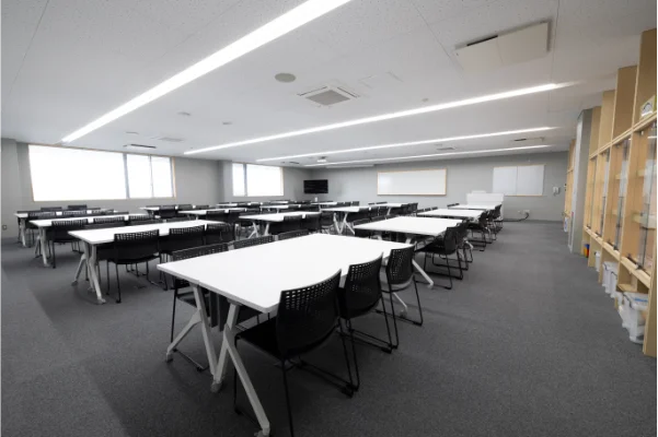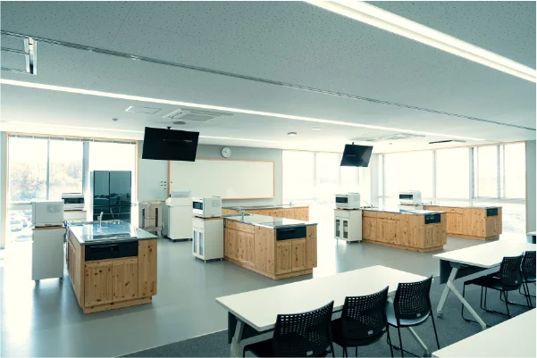 調理台5台を備えた調理実習室に座学スペースを併設し、実習と講義を同一教室で実施できます。地域住民を対象としたセミナーなどにも活用しています。