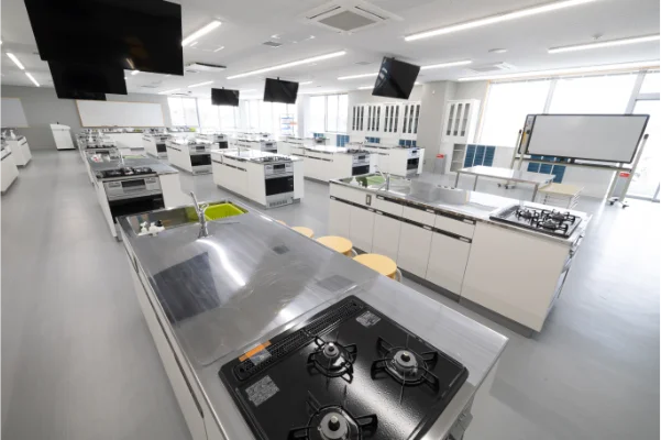 調理学実習室は、各種調理機器や調理テーブルを数多く備え、調理に関する基礎的な知識と技術を学びます。