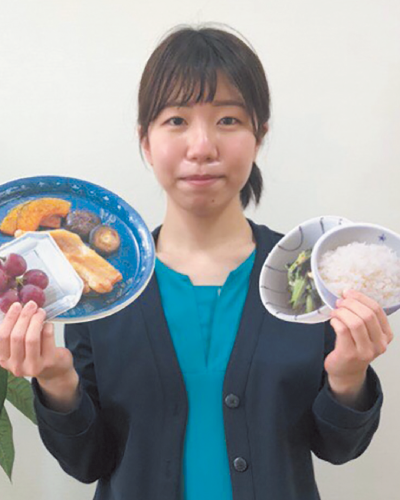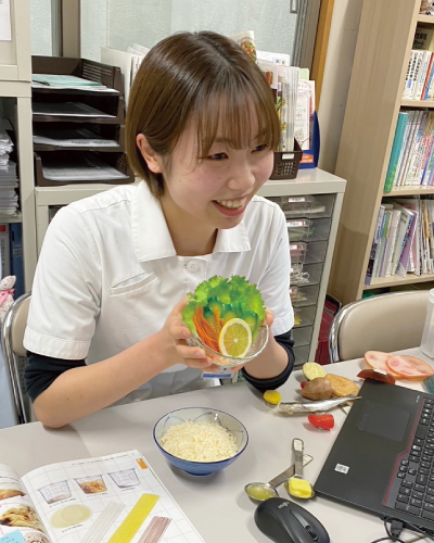 - 食べることが好きったので食に関わる仕事をしたいと思い、管理栄養士を目指しました。そして大学3年次の「介護栄養学実習」を通して利用者に楽しんでもらえる食事を考案することに魅力を感じ、福祉施設の管理栄養士として働きたいと考えました。
