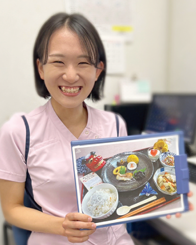 現在、病院と併設の介護医療院の管理栄養士として、栄養管理や給食管理、栄養指導を行っています。栄養指導ではどうしたら「食べる楽しみ」を持ち続けながら食生活を改善できるのか、患者様と一緒に考えながら行っています。検査値や体調、患者様自身の考え方に良い変化が見られた時は、やりがいを感じます。