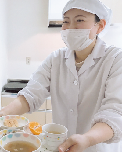 - 誕生日やハロウィンなどのイベントの際は、給食をいつもより工夫した内容にするので大変ですが、園児たちが楽しみながら積極的に食べる姿を見たり、野菜が苦手だった園児が以前より食べられるようになった様子を見たりすると、とてもやりがいを感じます。